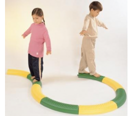由8片曲線觸覺板組合成的步道,可組合成各種變化路道,板上的突觸點提供腳底神經刺激,並練習平衡感,也可與直線觸覺板相互連接。