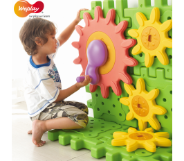 每片齒輪能與把手鑲嵌,並且固定於積木上,透過遊戲中的搬運、組裝與拆卸的過程,提升了肢體動作能力,促進手部肌肉發展與靈活度。
